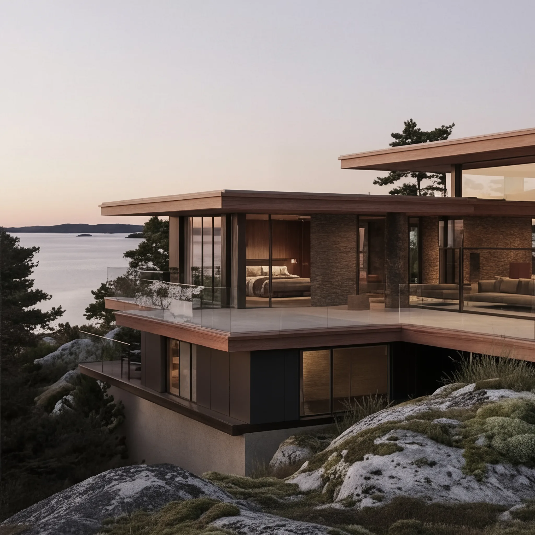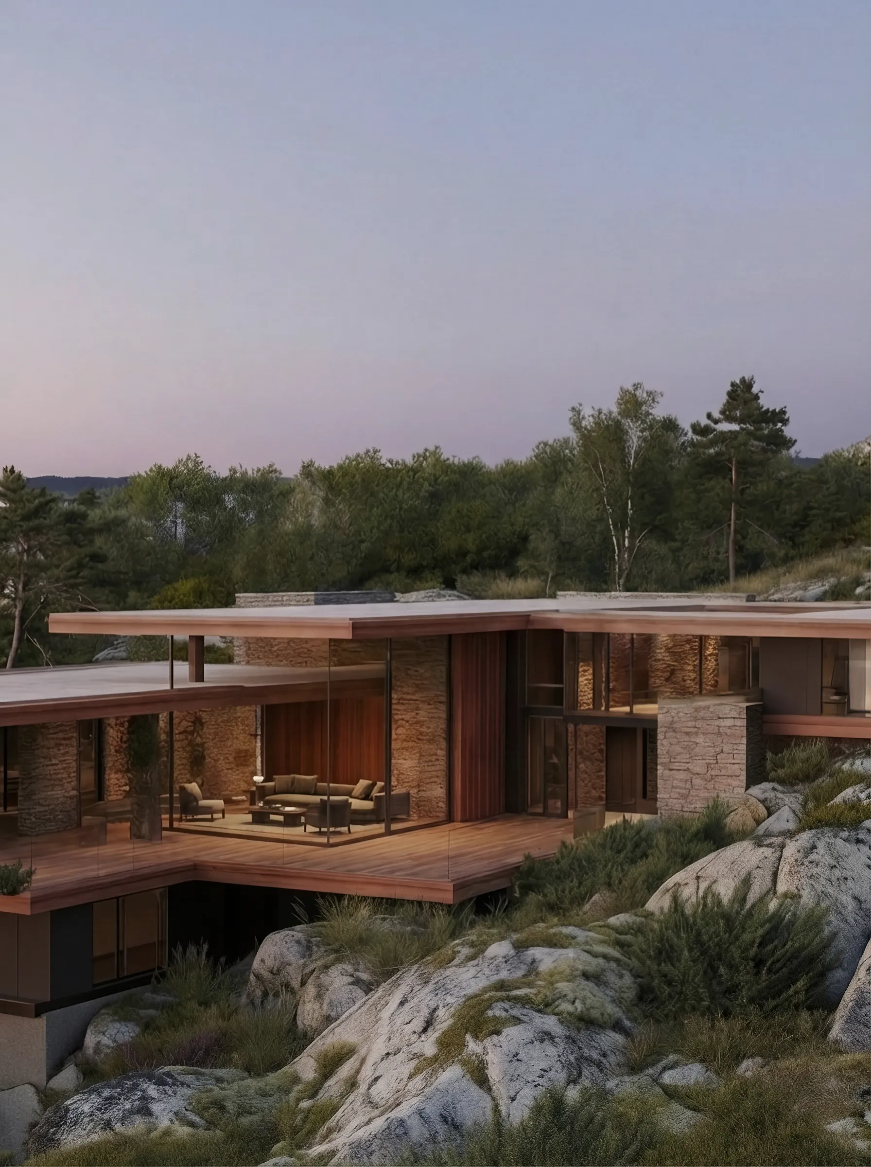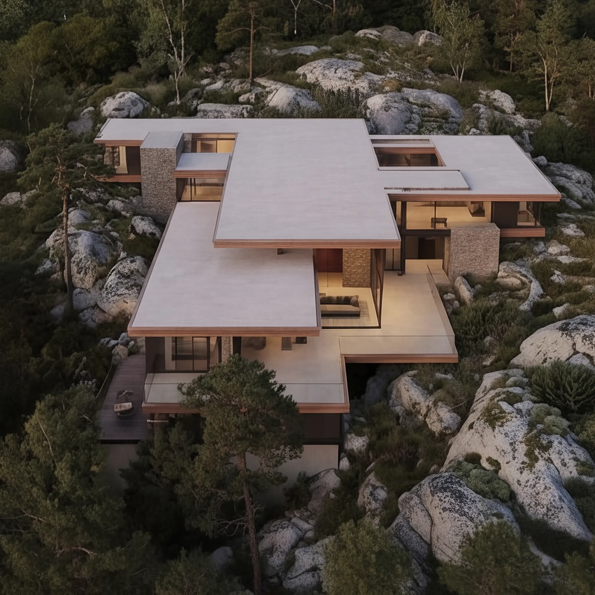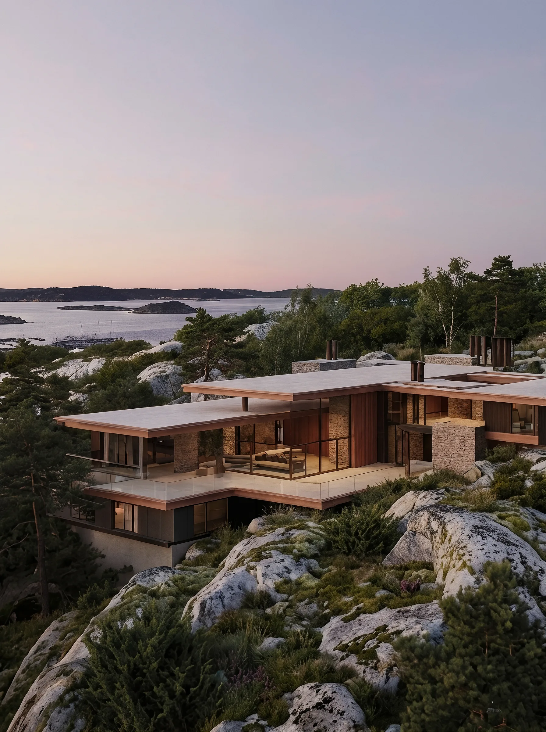 Villa A1 is conceived as a home where architecture grows from the landscape rather than being placed upon it. Set among exposed rock and coastal pines, the house follows the natural formations of the site, allowing the terrain to guide both form and movement. The result is a residence that feels grounded, calm and deeply connected to its surroundings.