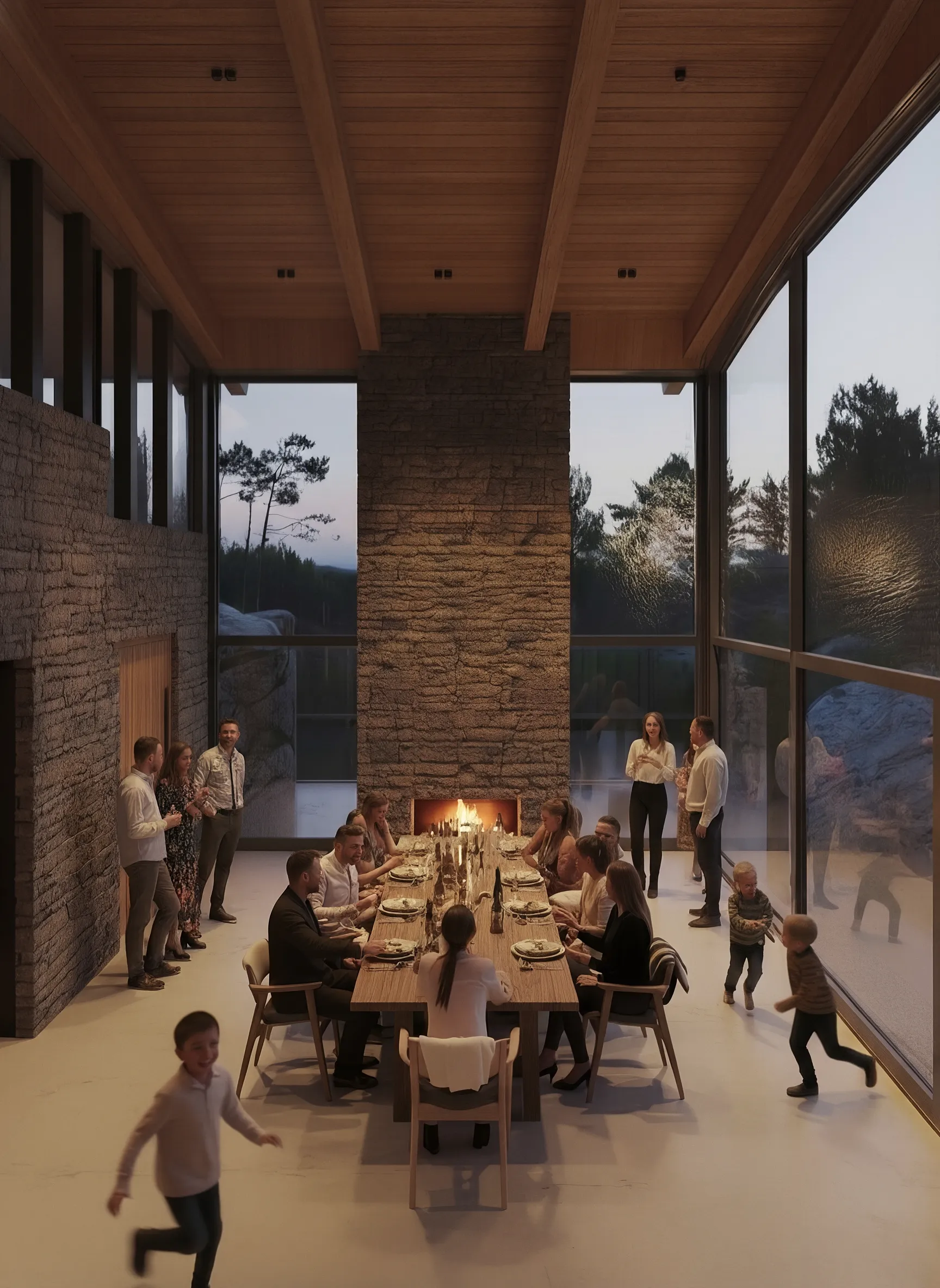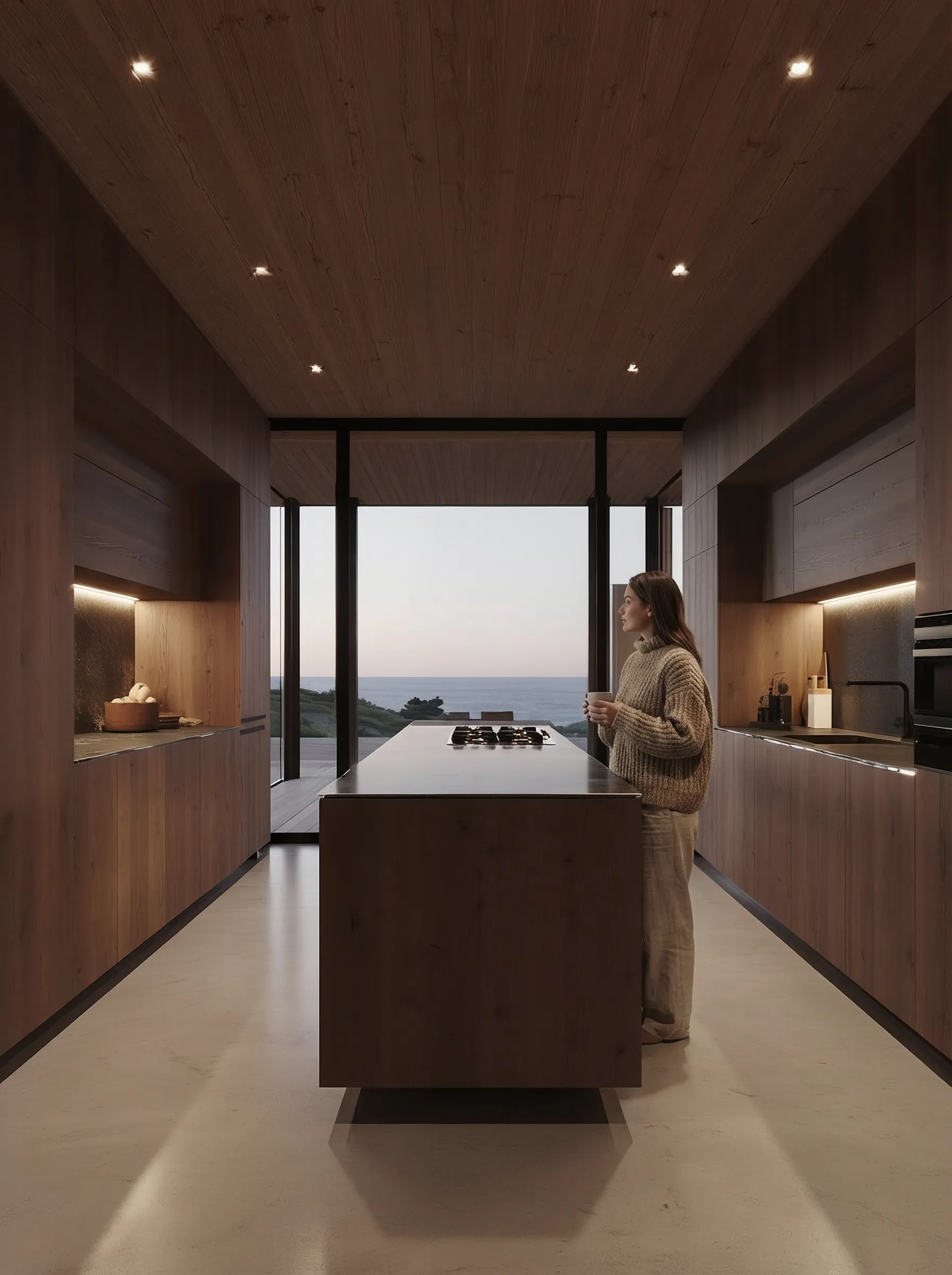 The home is designed to be both protective and open. Shielded from wind and weather, yet oriented towards the sea and the shifting light, the architecture balances solidity with transparency. Glazed corners dissolve the boundaries between inside and out, while terraces appear to float among the pines, offering places to pause, observe and inhabit the landscape.