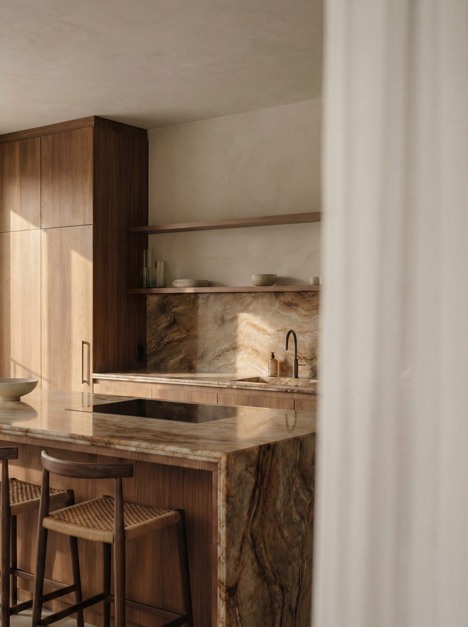 Inside, the layout balances openness and intimacy. The kitchen forms a warm social centre, while the open spaces allow light to move freely through the home, creating a sense of generosity and calm.