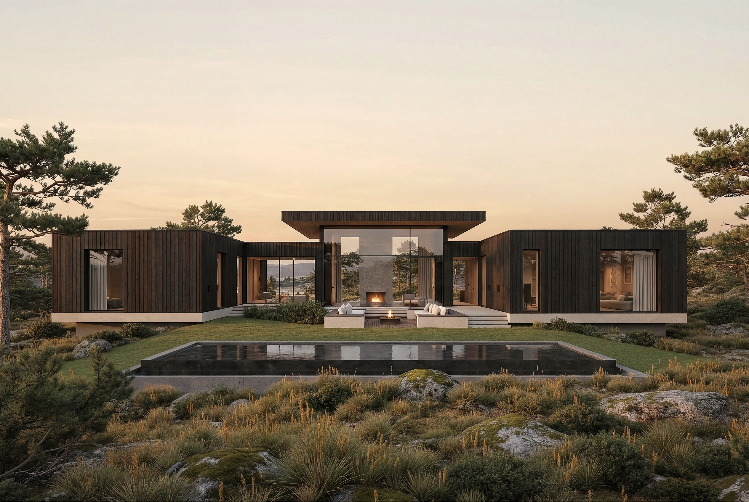 Villa Sandström is a striking yet restrained residence where Scandinavian minimalism meets the dramatic rocky landscape of Bohuslän. The architecture is defined by a careful balance between strong presence and quiet restraint, allowing the house to stand with confidence while respecting the stillness of its surroundings. The black charred timber cladding gives the building a distinct, monolithic character while naturally harmonising with the rugged coastal terrain.